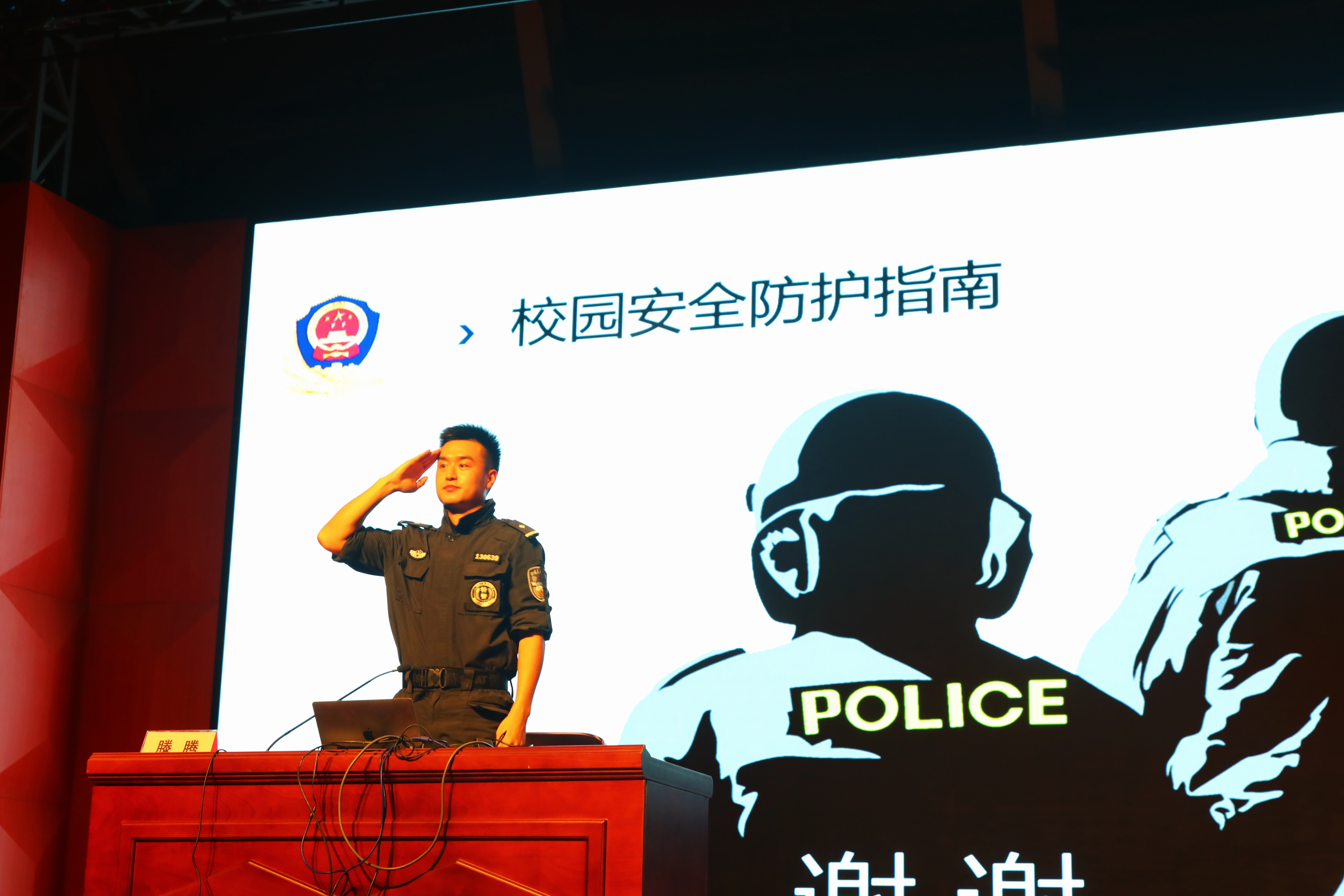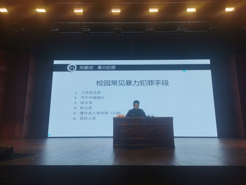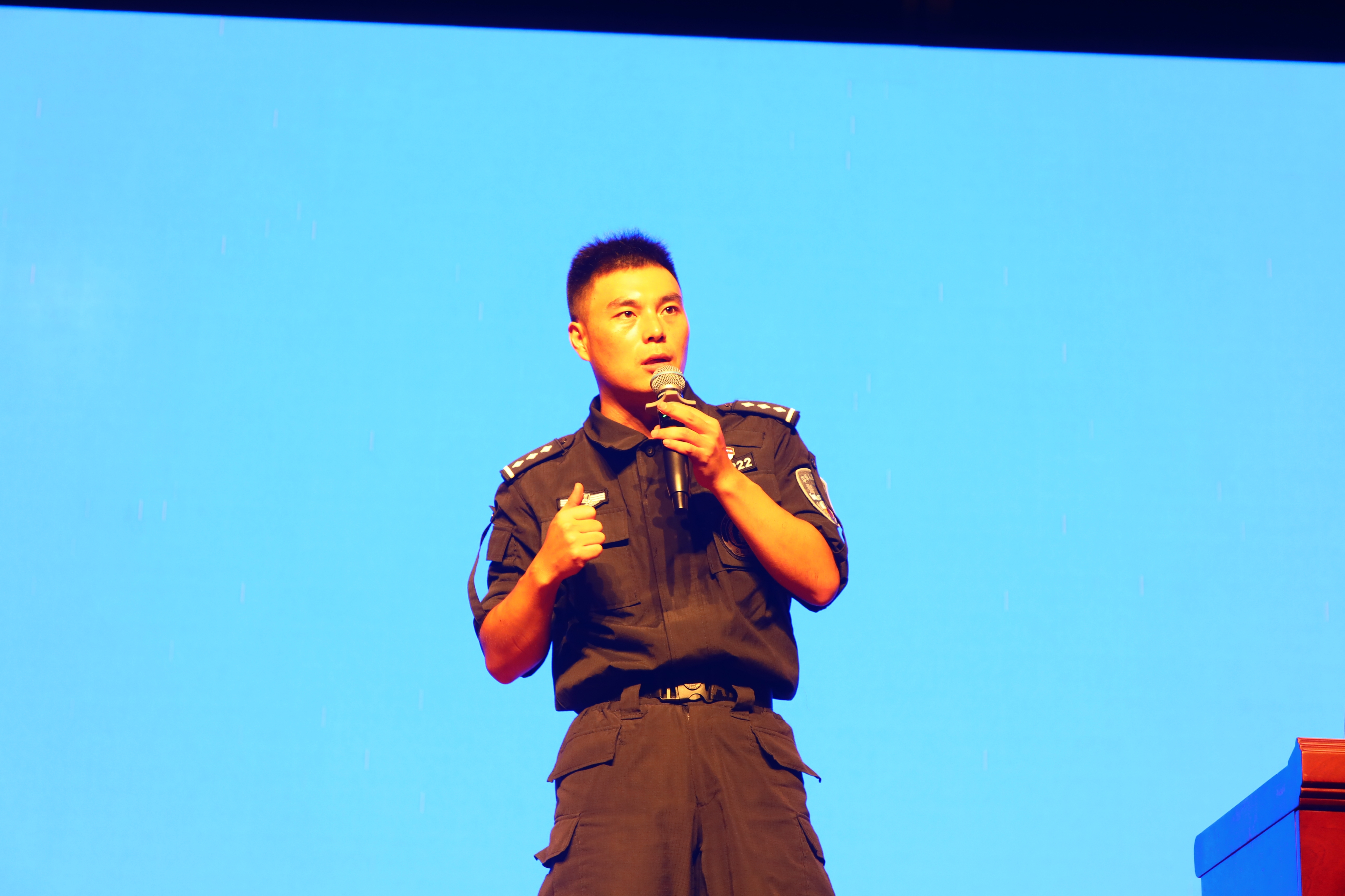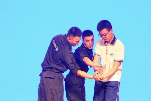 之后的师生校园安全防护讲座上,温州市特警支队的滕腾警官结合近几年国内连续发生多起伤及无辜学生的校园伤害事件,讲解了“什么是校园防恐防暴”“校园恐怖暴力的特点”和“校园防欺凌等”等安全知识,特别强调了“邪教及毒品的危害、校园火灾及极端事件应对方法、公共场所遭遇持刀劫持应对要点”等校园安全相关措施。为师生们梳理了应对各类突发事件时的“跑、躲”两字要领。胡警官通过概念讲解、模拟场景、技能展示等方式,为师生呈现了一堂生动的生命安全教育课。