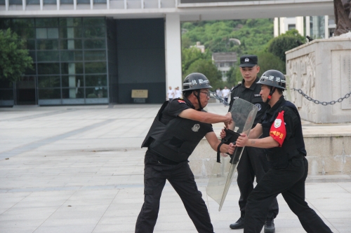 温州市特警支队郑金龙警官与校园安保人员采取了互动式的培训。为了贴近实战,特警队员现场演示,模拟演练了“暴徒”持刀伤人及其应对方法,并组织安保人员现场模拟自救、自护,并强调协作配合。整场演练持续半小时,过程紧凑、严肃、逼真,提升了我校安保人员的专业技术,增强和丰富了安保人员及师生对校园突发暴力事件的应对能力及实战经验。