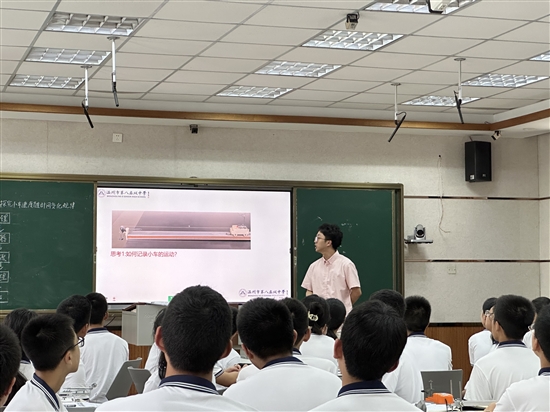 温州市第八高级中学的吴鹏老师开课,吴鹏老师开出《2.1 实验:探究小车速度随时间变化的规律》一课。课前吴老师通过伽利略斜面实验引入课题,激发学生兴趣。并在学生分组动手实验过程中巡视,善于发现学生的操作典型错误,及时进行讲解。数据处理结合AI,生动演示了如何将传统物理实验与现代传感技术相结合,提升了课堂的互动性和科学性。