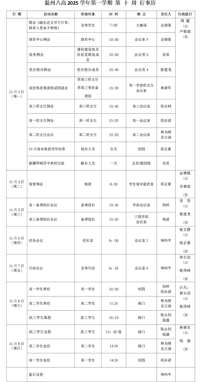 温州八高2025学年第一学期 第 十 周 行事历
