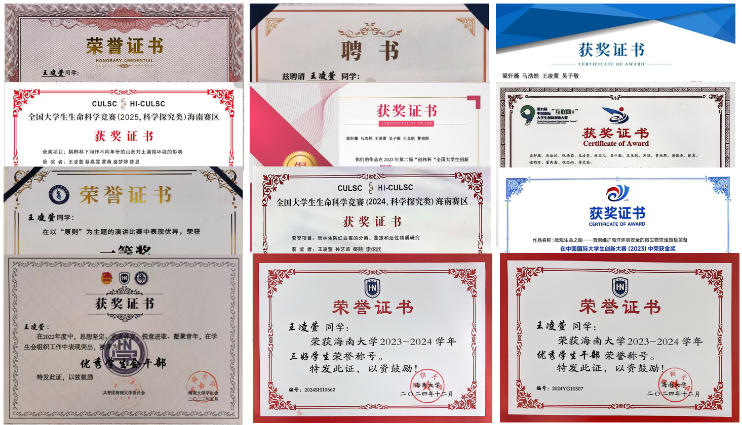 1.第九届、第十届全国大学生生命科学竞赛海南赛区三等奖;