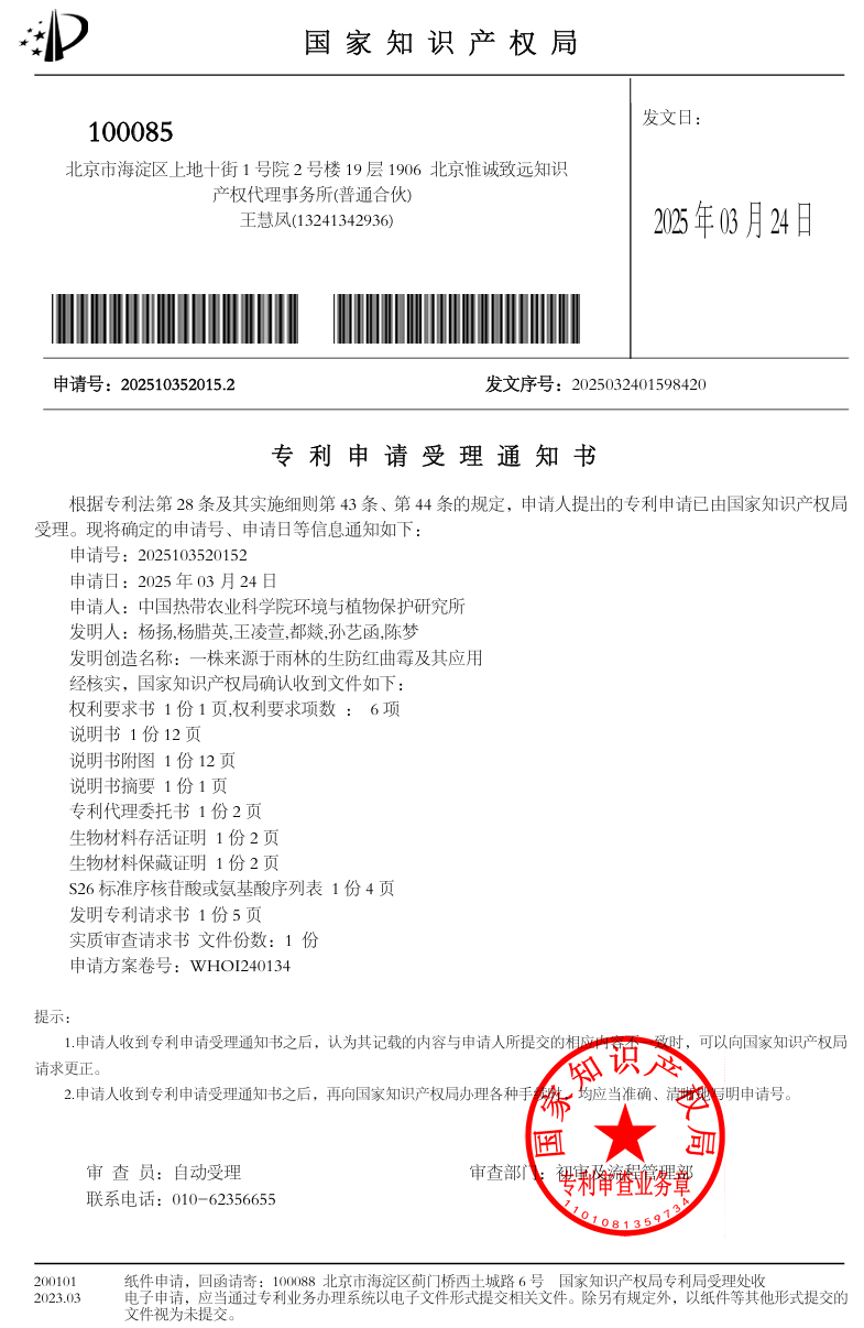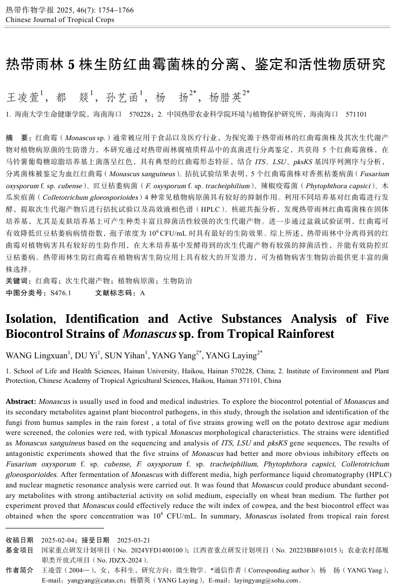 1.加入中国热带农业科学院环境与植物保护研究所,主持“雨林生防红曲霉的分离、鉴定与活性物质”研究,以第一作者在北京大学核心期刊发表《热带雨林生防红曲霉的分离、鉴定与活性物质研究》,一项菌种专利正受理;