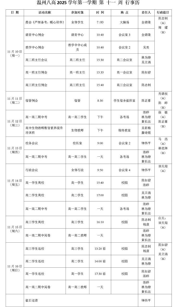 温州八高2025学年第一学期 第 十 一 周 行事历