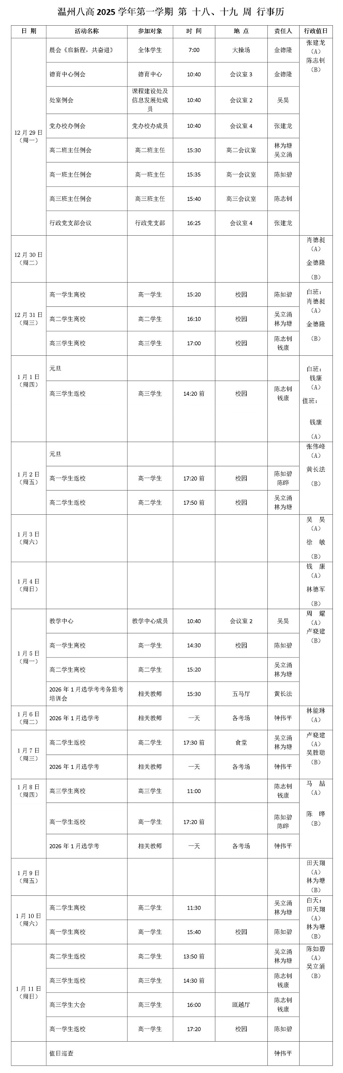 温州八高2025学年第一学期 第 十八、十九 周 行事历