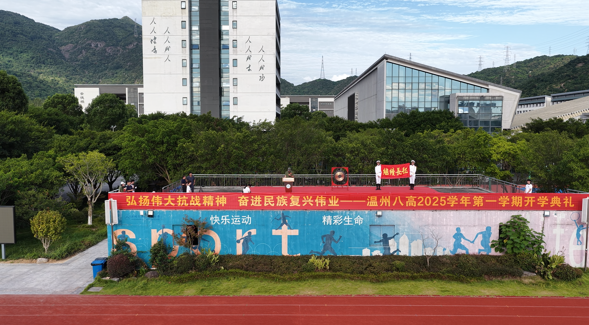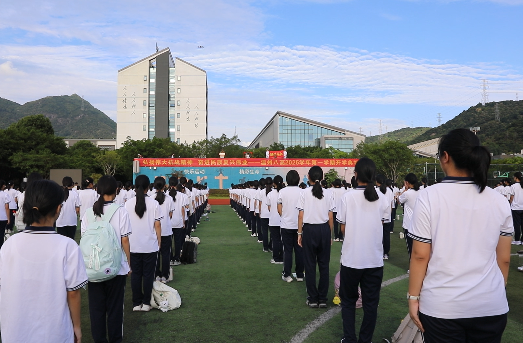 9月1日,温州市第八高级中学隆重举行“弘扬伟大抗战精神,奋进民族复兴伟业”2025学年第一学期开学典礼,纪念中国人民抗日战争暨世界反西斯战争胜利80周年。温州市全民国防教育协会执行会长杨文龙,全体同学、班主任与行政团队参加典礼。