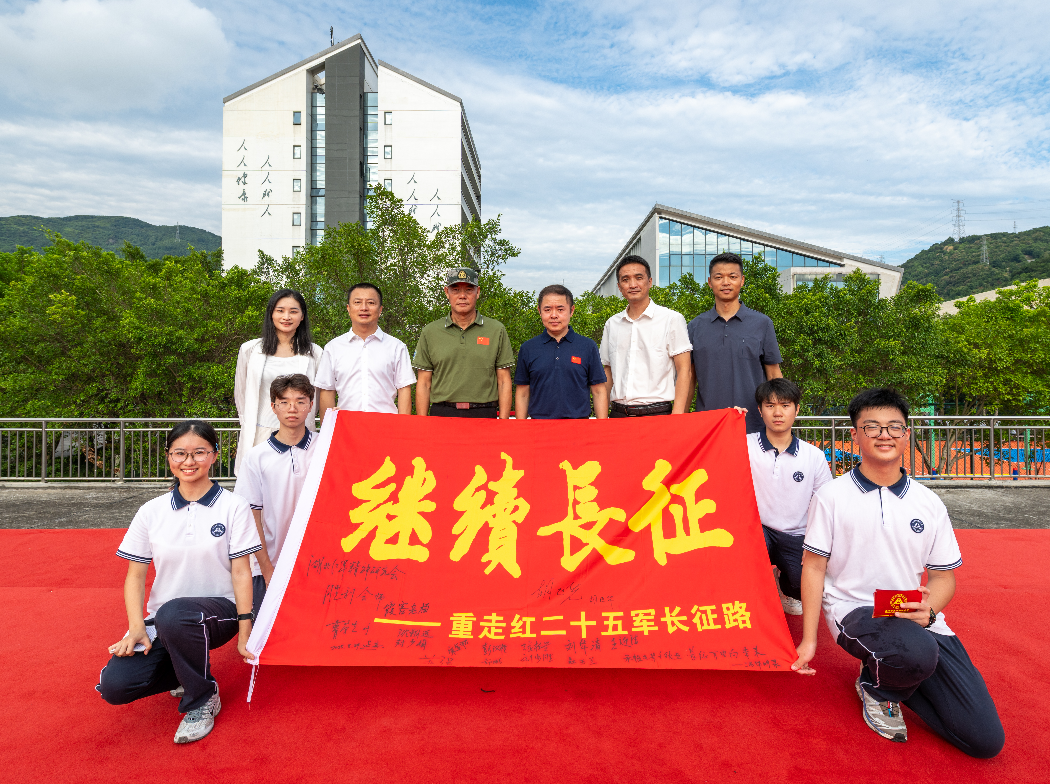 杨文龙将其重走25军长征路时带回的、有108岁老红军胡正先爷爷等老英雄老战士亲笔签名的“继续长征”旗帜带到现场,珍贵的签名,闪闪发光的四个大字,胡正先老英雄“听党话,跟党走,好好学习,天天向上”的谆谆教诲,字字千钧,穿透时光,无不震撼着同学们的心灵。“再难再苦,想想民族屈辱;再苦再累,想想革命先辈!”铿锵有力的话语,勉励着所有同学,要铭记历史,从抗战中汲取力量,树立远大理想,珍惜和平时光,勤奋学习知识,锤炼过硬本领,将爱国之情、强国之志、报国之情融入到日常学习和未来生活中,努力成长为担当民族复兴大任的时代新人。