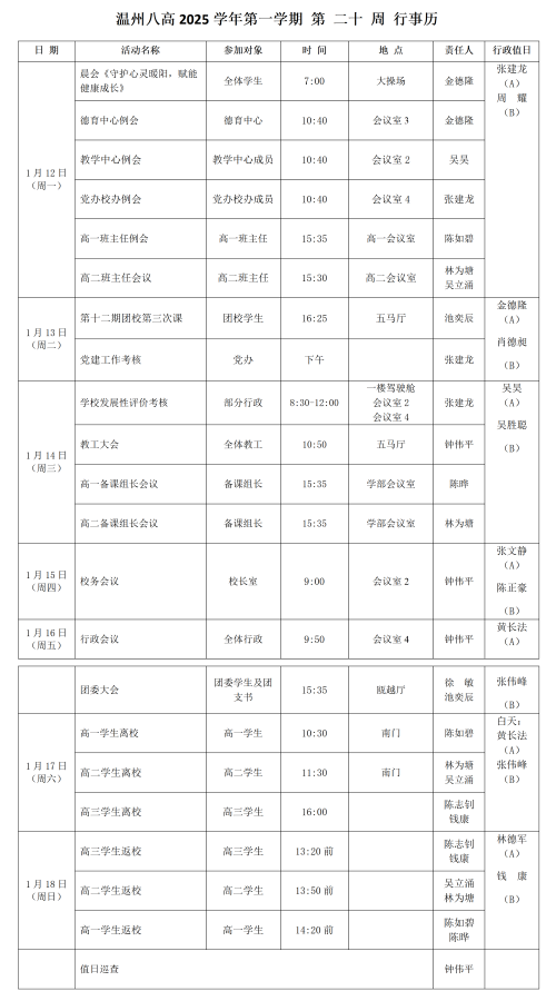 温州八高2025学年第一学期 第 二十 周 行事历