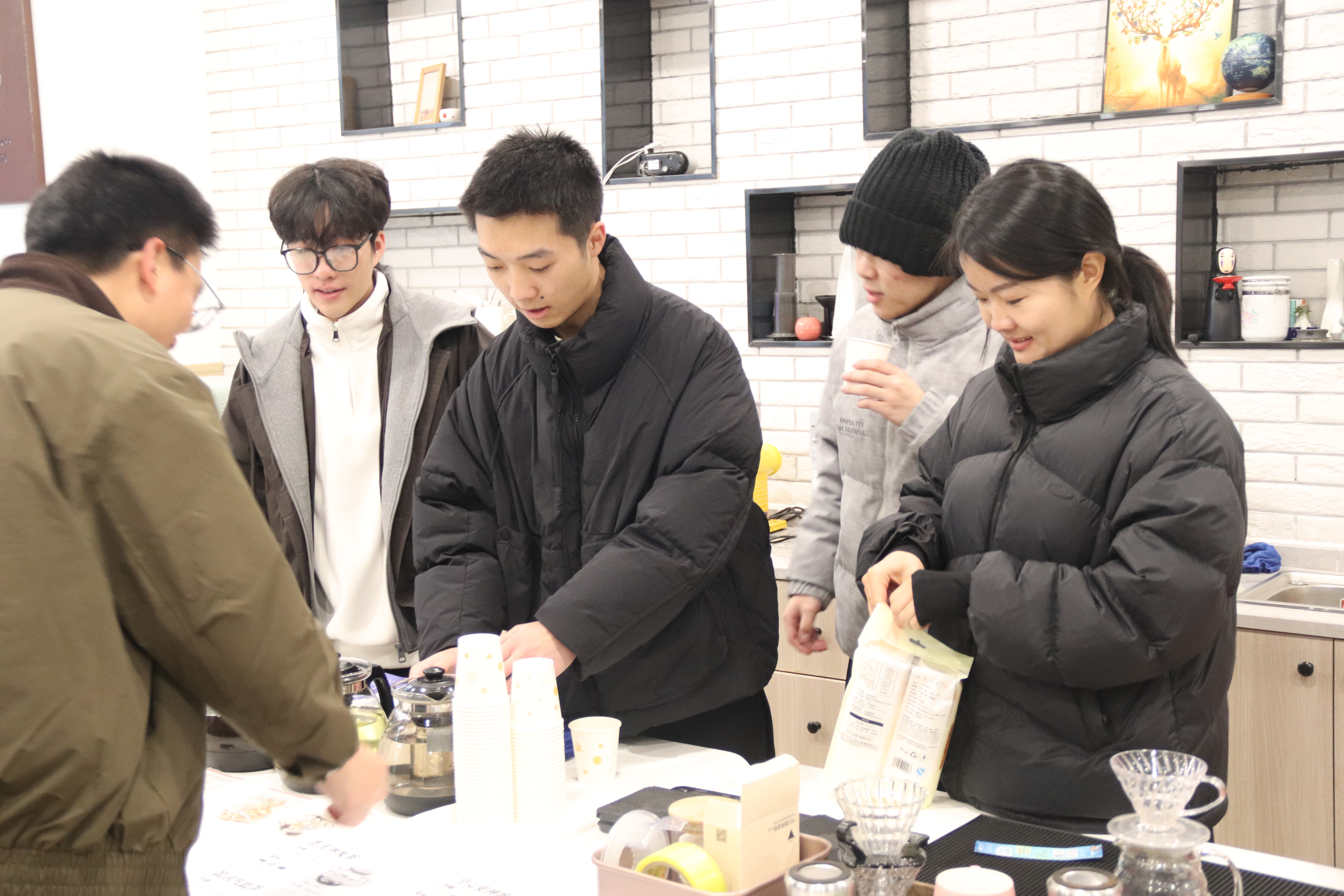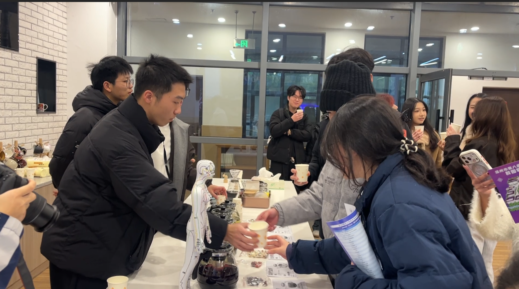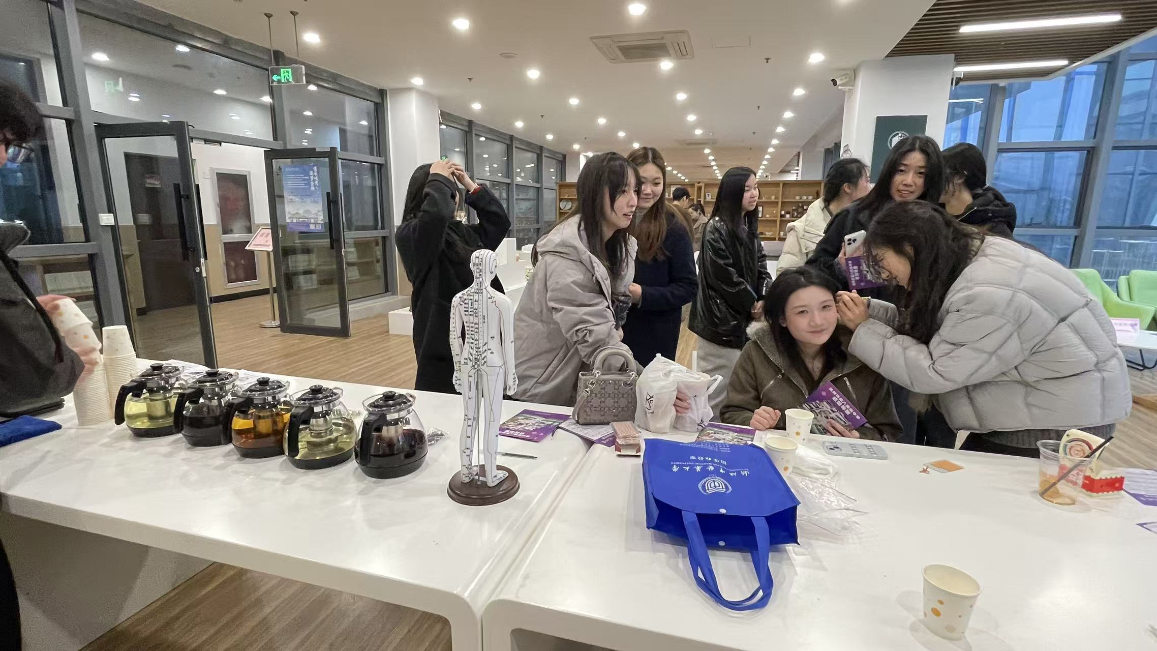 “平时有哪里不舒服吗?”“养生茶可以健胃暖脾。”“推拿有助于释压放松。”“医师们”的轻声问候夹杂着同学们痛苦而又享受的声音,茶台前的“服务员”对各种茶品深入浅出的介绍,茶水从壶嘴流入纸杯,温暖了身体,驱散了寒意。
