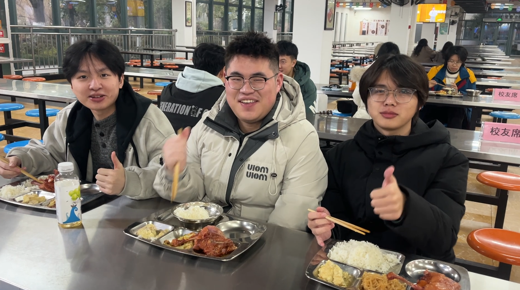 “开饭了!冲!”“有蒸鸭和水煮肉片!”“有‘八高那碗面’!”