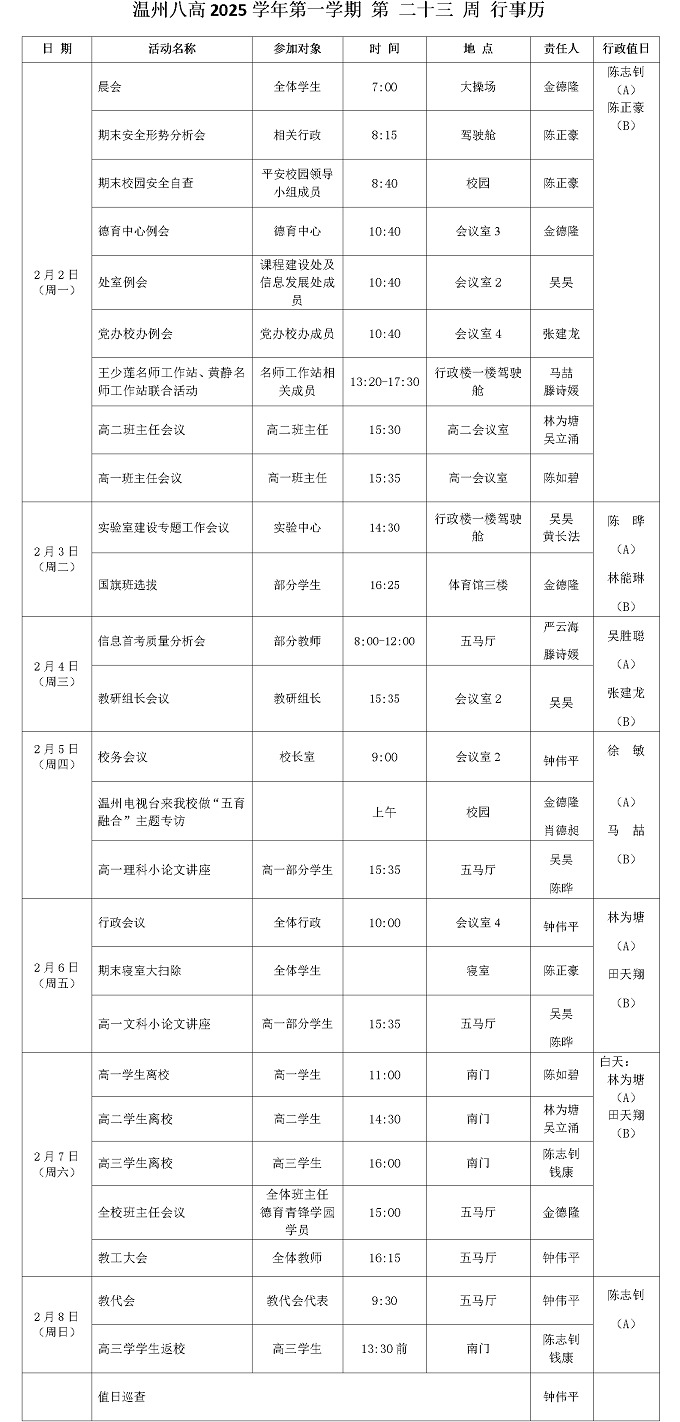 温州八高2025学年第一学期 第 二十三 周 行事历