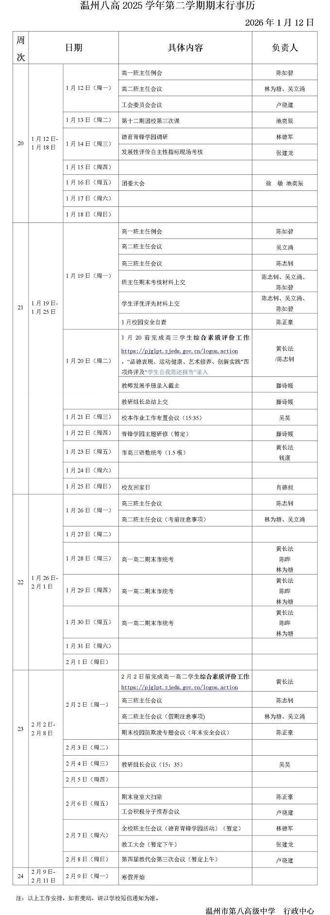 温州八高2025学年第一学期期末行事历