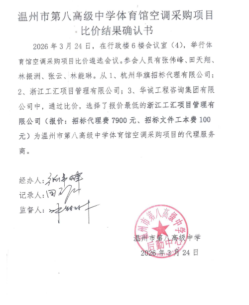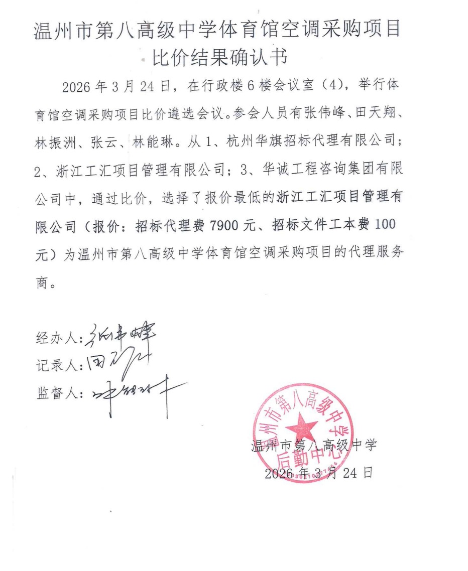 温州市第八高级中学体育馆空调采购项目比价结果确认书