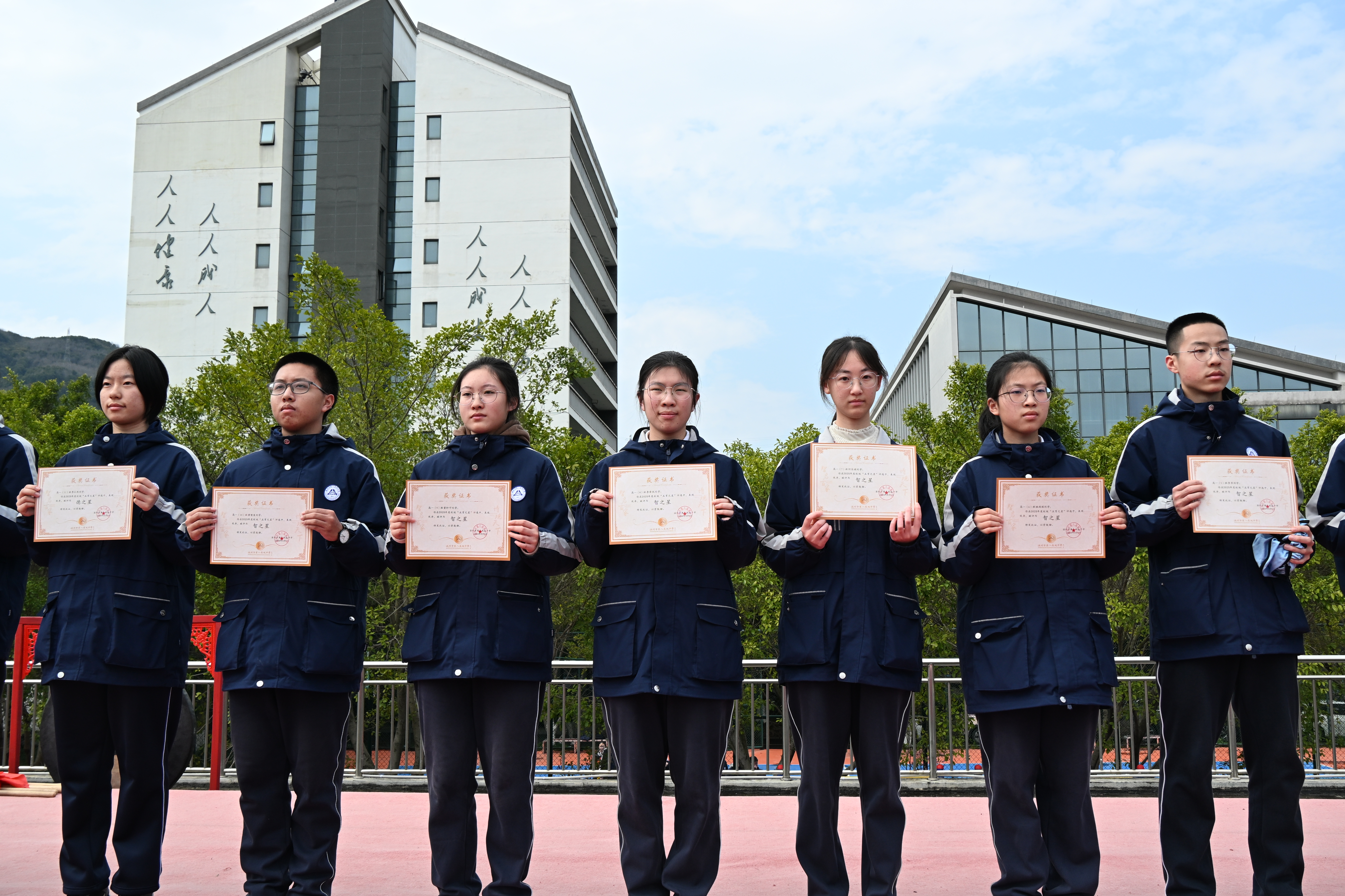 典礼上,国旗护卫队首次身着新式礼服亮相——笔挺的制服、锃亮的皮靴、整齐的步伐,护送五星红旗冉冉升起——崭新的装束象征着新学期的崭新行动,每一次正步都是对责任最铿锵的承诺。“五育之星”颁奖仪式上,德、智、体、美、劳五个维度各绽光芒。高一1班潘浩宇作为代表分享心得:“踏踏实实做好每天的每件小事,当优秀成为习惯,荣誉自然就来。”他用日复一日的微小行动诠释了“优秀是一种习惯”的真谛。陈跃川为综合表现最优异的同学颁发“跃川”奖学金——而立之年回馈母校,他的行动证明:点滴积累终能汇成大爱,平凡起步亦可成就非凡。