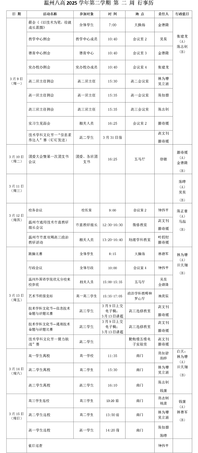 温州八高2025学年第二学期 第 二 周 行事历